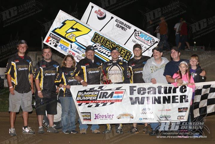 Bristol, WI – July 17, 2014. Bill Balog and the B2 Motorsports team made the short haul to Wisconsin’s “Horsepower Half-Mile” of the Dodge County Fairgrounds this past Friday night for the annual Rick Schmidt Memorial. The night started off with Bill laying down the 2nd fastest lap of the twenty-seven cars on hand lining him up with a 6th place starting position in the heat race. At the drop of the green, Bill quickly made his way into the 3rd position right on the 2nd place car’s tail. Bill made his way into 2nd one lap later and tracked down the leader and made his way into the lead a lap after that. Bill easily cruised to a heat race win transferring him into the twenty-three lap feature. Quick-timer Travis Whitney would pull the #3 pill for the feature invert setting Bill up with a 5th place starting position. When the green would fly Bill would make his way into the 4th position before the caution would fly on Lap #1. When racing resumed, Bill quickly disposed of 3rd place running Jordan Goldesberry and entered a spirited battle with Scotty Neitzel. While Bill and Scotty battled, leader Whitney began to open a huge lead. The 17B and the 2W would battle until on lap eight when Bill would make his way by and begin tracking down Whitney who had opened more than a straight-away lead on the flat half-mile. On lap fourteen, Whitney was trapped in lapped traffic which helped Bill cut the lead by half. The next lap Bill was within a few car lengths as Whitney was still in heavy lapped traffic. Bill would make his way under the #16 and into the lead on lap sixteen and masterfully weaved his way through the traffic until the checkered flag flew winning by nearly a straight-away over Whitney and Steve Meyer, picking up his 5th straight IRA feature win of 2014.