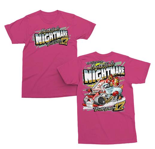 Introducing the ultimate race day attire: the "North Pole Nightmare Arctic Racer" shirt! This dynamic design features the legendary North Pole Nightmare behind the wheel of the 17B. But wait—there's a twist! This isn't just any ordinary sprint car; it transforms into a snowmobile powered by the sweetness of Anderson's Pure Maple Syrup.