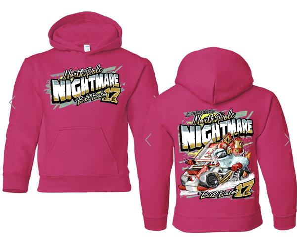 Introducing the ultimate race day attire: the "North Pole Nightmare Arctic Racer" hoodie! This dynamic design features the legendary North Pole Nightmare behind the wheel of the 17B. But wait—there's a twist! This isn't just any ordinary sprint car; it transforms into a snowmobile powered by the sweetness of Anderson's Pure Maple Syrup.