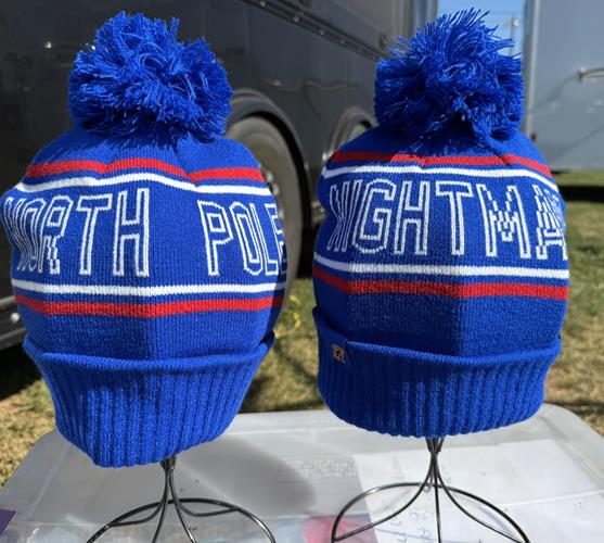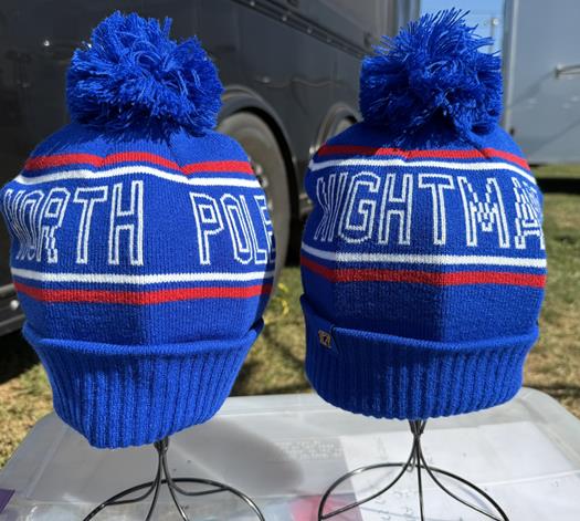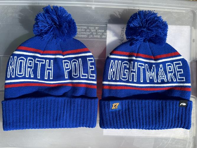 Warm vintage cuffed knit 'North Pole Nightmare' winter Pom hat. Royal with red and white detail. Gold 17B tag.